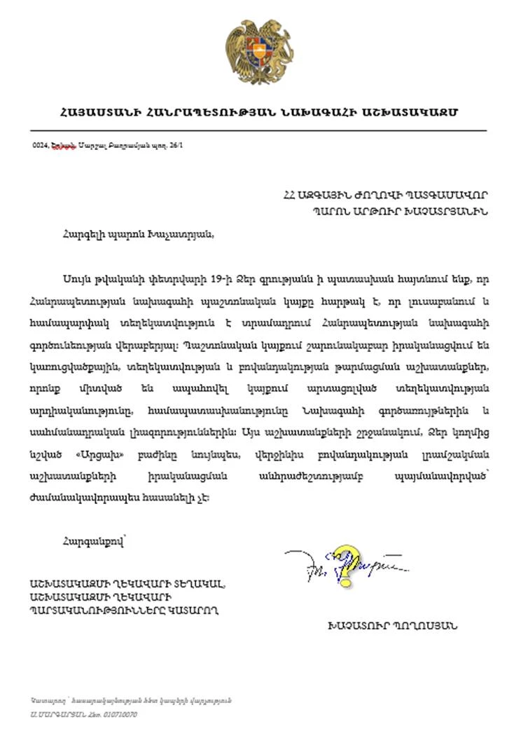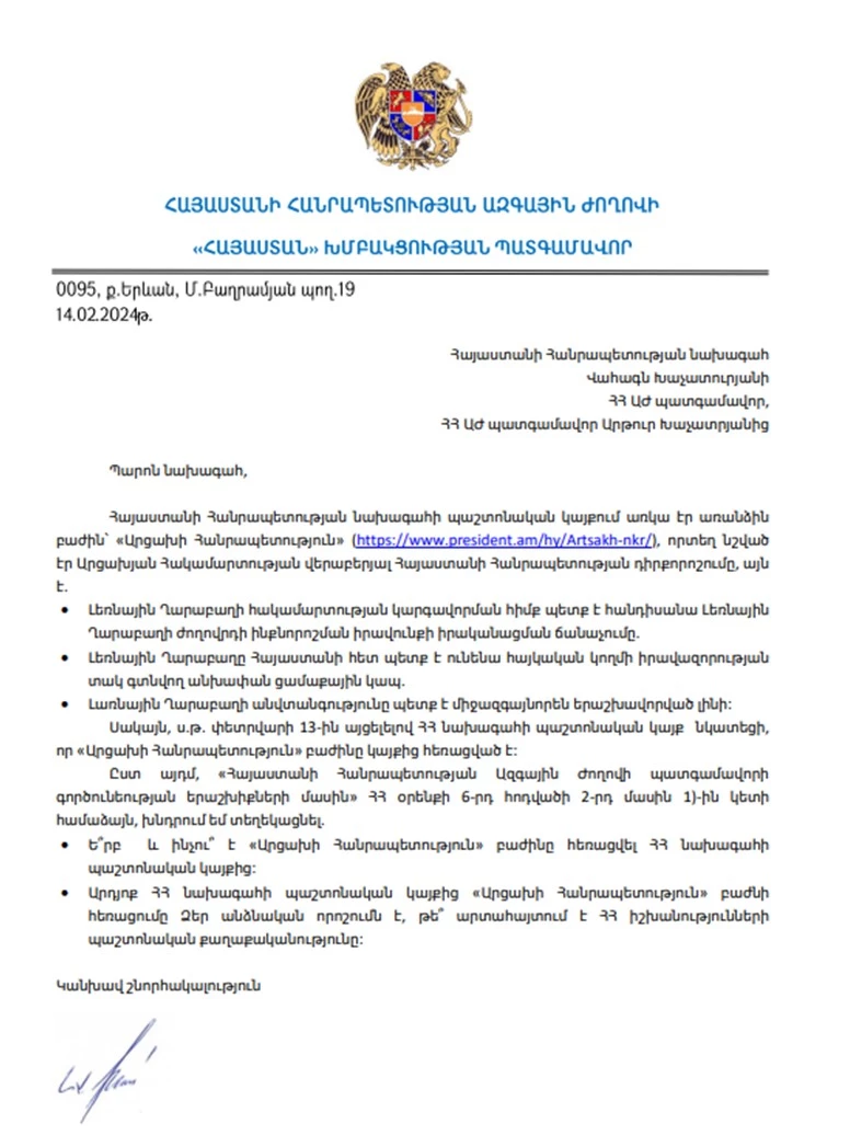 ԱԺ «Հայաստան» խմբակցության պատգամավոր, դաշնակցական գործիչ Արթուր Խաչատրյանն ահազանգում է՝ Հայաստանի նախագահի պաշտոնական էջից հանել են «Արցախի Հանրապետություն» բաժինը։